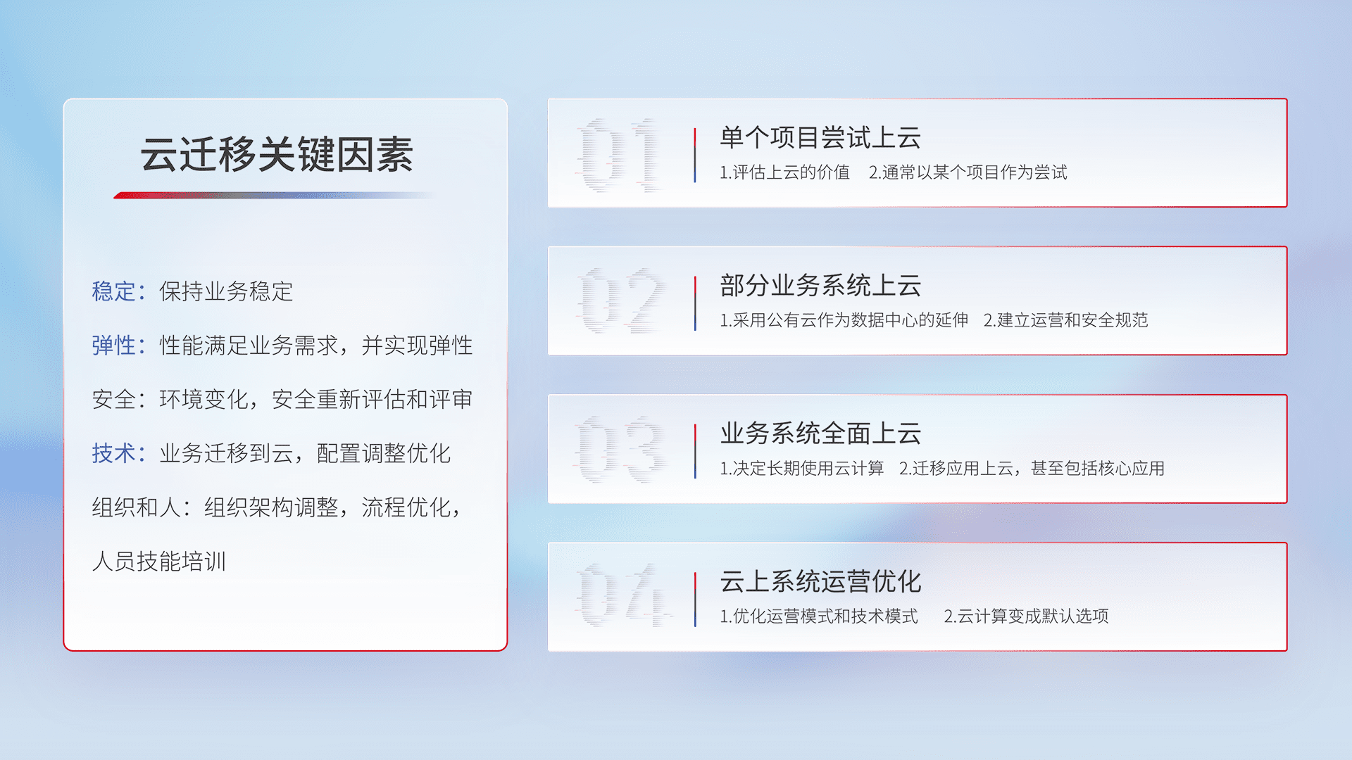结合实际业务,,,,从规划设计、、、云平台选型、、、、云原生改造、、数据迁移、、、、集成交付,,,,迁移全过程为客户识别最佳上云路径,,做好风险识别管理,,,,设计网络架构、、身份权限、、安全审计合规、、、操作审计、、、日志审计、、、监控告警策略、、、多站点容灾设计等,,,对云上基础设施进行整体规划,,提升IT治理水平,,,以满足弹性、、、高可用、、高性能的需求。。。。