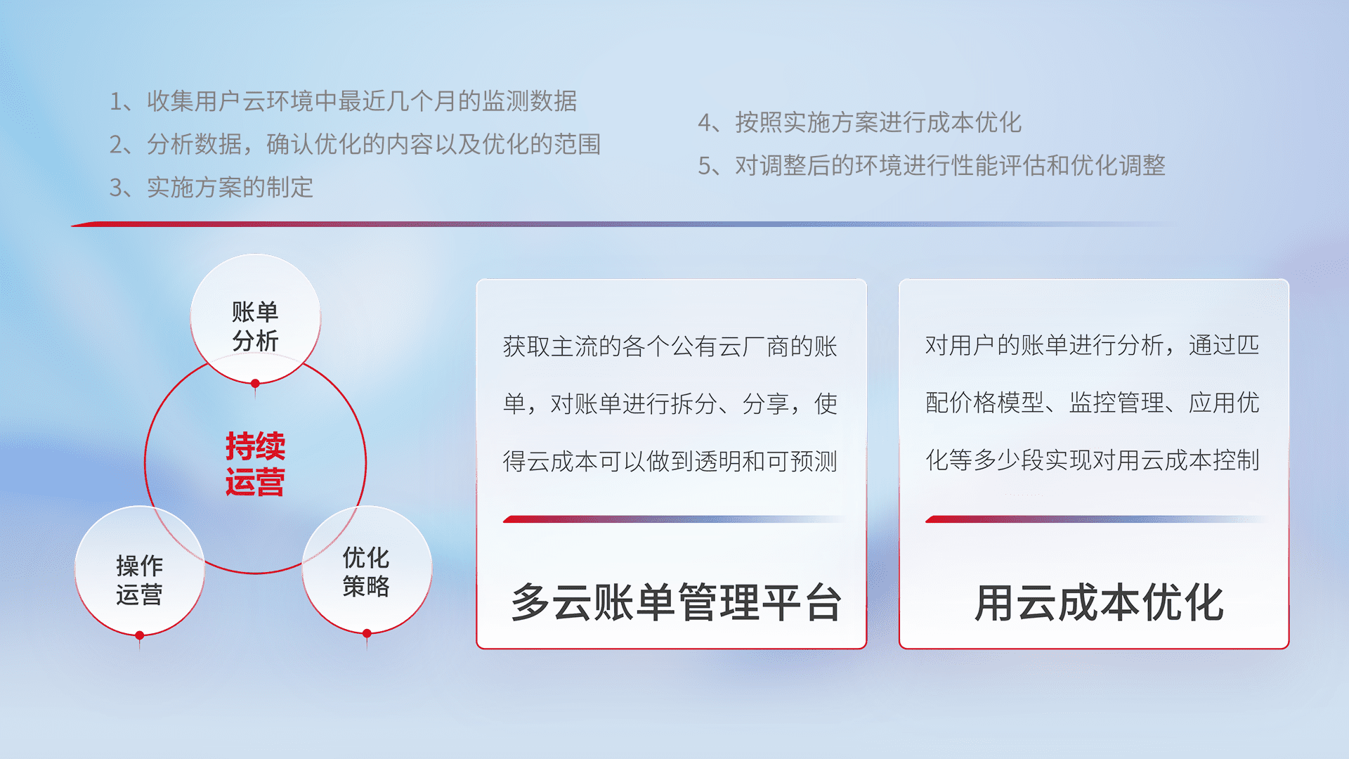 通过多云纳管,,,以统一的资源数据模型把客户的云资源进行抽象和封装,,进而实现对多云资源的统一操作,,,保障云资源管理的可靠性、、、、稳定性与可用性。。量身定制化运维内容,,配置、、开发运维、、、补丁管理、、备份、、、监控、、认证和访问管理、、审计和日常巡检等,,保障在用云过程中的可靠度,,,稳定度以及高可用率。。